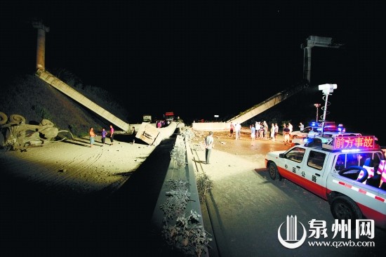 本报讯(记者张沼婢 林劲峰 黄雅珊 王金植 陈小阳 施海燕 文/图)昨晚8时许,泉三高速公路三明往泉州方向永春路段,一辆水泥罐车撞到上方引水渠下的桥墩,导致引水渠倒塌,该路段交通全部封闭。肇事司机受伤,被送往医院抢救。