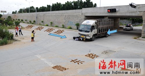 事发点是一个交叉路口,东西走向是是霞东路,南北走向是惠泉南路,霞东路一侧有个涵洞。路口安了两个红绿灯,其中一个安在涵洞口处。相撞的货车,车身上写有“惠安县牲畜定点屠宰场”,事发时,正是从这个涵洞出来,要到附近一家汽车维修厂。是不是货车司机看不到涵洞口处的红绿灯,才酿成悲剧?惠安交警仍在勘查,并未就此证实。