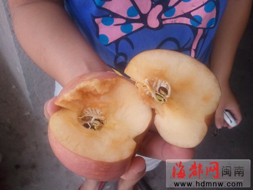 华女士说,苹果之前曾掉在地上过,产生裂痕。昨天上午9点多,她将苹果切开,发现里面的籽居然都发芽了。吃了这么多年苹果,从来没有见过发芽的,左邻右舍也都很惊讶。华女士担心发芽的苹果可能有毒,就不敢让女儿吃了。