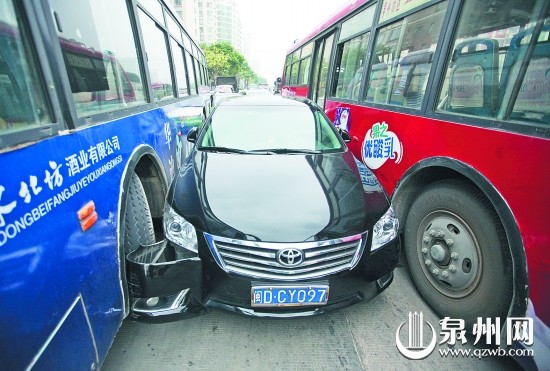 小轿车被夹在两辆公交车之间,动弹不得。