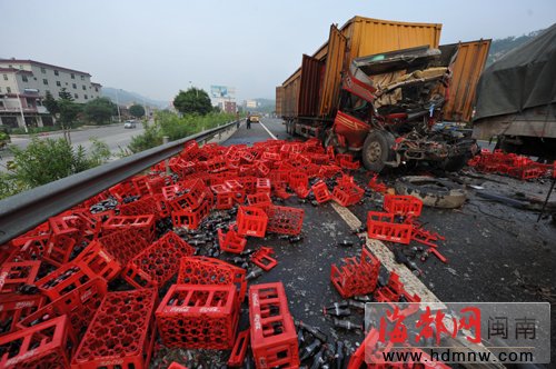 事件实录:撒满一地的是装可口可乐饮料的红色塑料箱,货车的车厢里还有很多,不过,司机谢师傅已经看不到了,现场10多米长的刹车痕,还是没能让急速的车停下来,车头几乎完全撞烂,他也当场死亡。