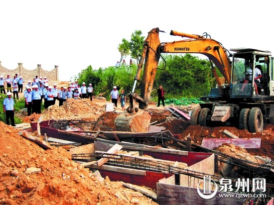 早报讯 (记者林福龙 文/图)未经任何部门审批,当地居民在防洪堤规划用地范围内相中一块地,挖地基、倒水泥,说是要建庙。昨天下午,鲤城区城市管理行政执法局出动100多名执法人员,使用挖掘机,消除了这处仍处于萌芽状态的违法建筑。