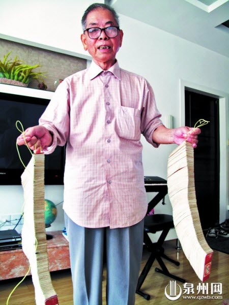 老冯把收集整理的有关猜字谜的读书卡片装订成捆