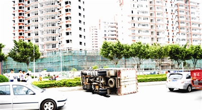 东南网-海峡都市报9月22日讯(记者 董加固 田米 文/图) 昨日上午8时35分左右,307省道泉州市区北峰见龙亭小区门口段,75岁的曾阿伯从小区门口,横穿马路过中间绿化带时与一辆货车相撞。货车侧翻(如图),而曾阿伯因伤势较重不幸身亡。目前,事故原因丰泽交警大队正在调查中。