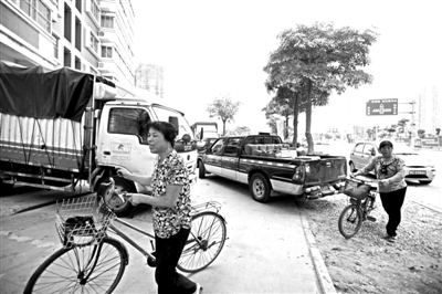 昨天下午5点半左右,邦邦来到宝洲花园小区发现,小区门口紧靠着云鹿路一端的非机动车道上,几乎整条路被货车所占。进出卸货、装货的车辆,最多时达到十几辆——小型面包车、大型货运卡车。一位阿姨骑自行车经过,见路被堵,只好推车绕行。邦邦看到,即便是走路或者推车,剩下的道路也很窄,还要随时提防货车倒车。