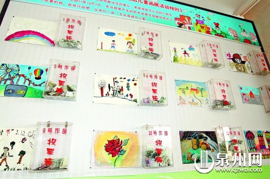 咄咄怪事,泉州某酒店有一个儿童画展,每幅画边放了一个小投票箱,1元钱即可投票。昨日,泉州网友“陈英杰摄影”在微博上贴出了照片。