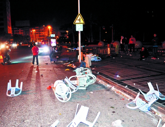 昨日清晨4时17分,晋江交管二中队民警赶到现场时,只见一个小吃烧烤摊被撞得一片狼藉,椅子东倒西歪散落一地,摊主坐在路边很愤怒。