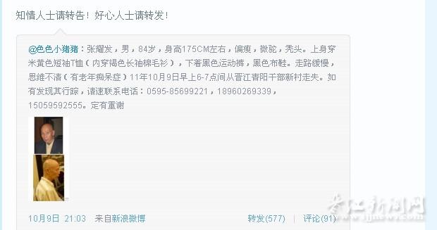“张耀发,男,84岁,身高175cm左右,偏瘦,微驼,秃头……10月9日早上6-7点间从晋江青阳干部新村走失……”9日晚9时许,一条寻人微博被众多网友转发。据了解,此条寻人微博发布不到三个小时,便被@晋江新闻网 等多家媒体与单位的官方微博转发,寻求热心网友帮助。