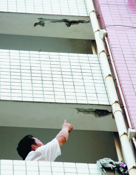 楼道转台出现裂痕,可见里面的钢筋。