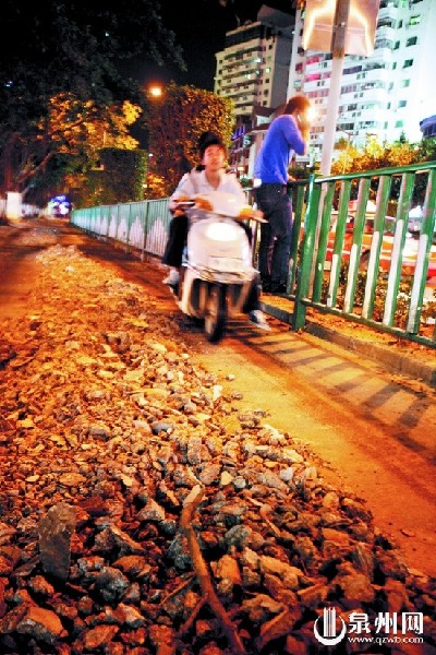 昨晚9时许,有读者向本社24小时热线电话96339报料称,泉秀街与田安路交叉处非机动车道上堆着很多碎石子,给过往行人造成极大不便。记者赶往现场,见到市民所说的这段非机动车道,确实是布满碎石子。