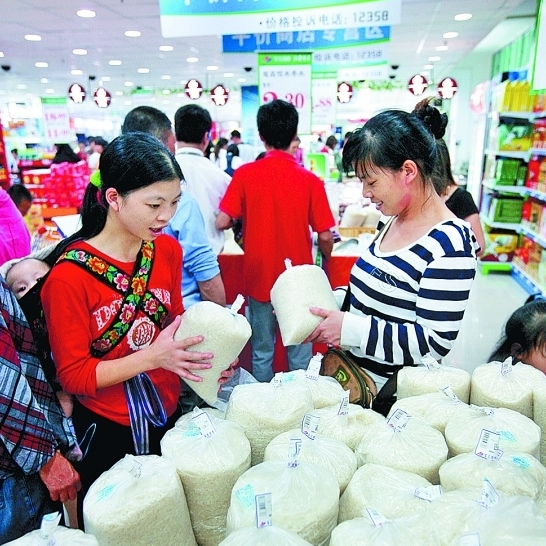 昨晚,市民在中闽百汇泉秀店平价销售区购买大米。(陈起拓 摄)
