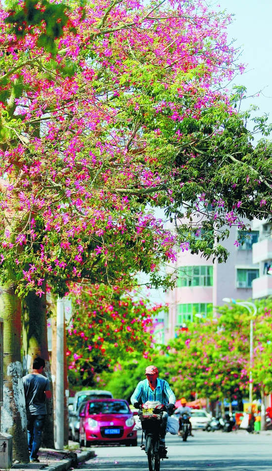 串粉红色的异木棉阳光照耀下,一串串粉红色的异木棉,为市区妙云街增色不少。它不是一朵两朵、羞羞答答地开,而是一树红花竞开放,为经过的市民带来温暖、活泼的气息。 (陈小阳 廖培煌 摄)