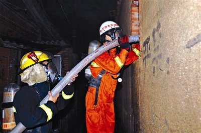 消防队员从窗口灌水