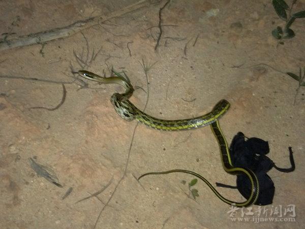 东南网-晋江经济报10月21日讯(记者 林雅萍 文/图)昨晚7:40,家住晋江青阳高霞社区的袁先生一推开门,一只硕大的老鼠就重重地从天花板摔到地上。“这么大的老鼠,我非得给它抓住了不可!”袁先生扔下东西,顺着老鼠逃跑的方向追过去,没想到,老鼠没见着,却被床底下的一幕吓傻了———一只黄黑相间的蛇正对着自己吐舌头!