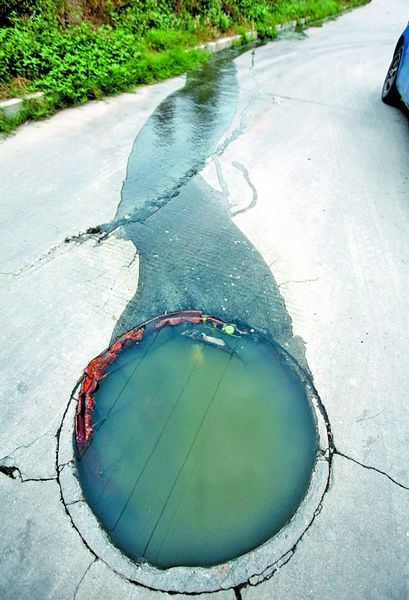 常泰街道华锦路一个井盖破损,污水横流。