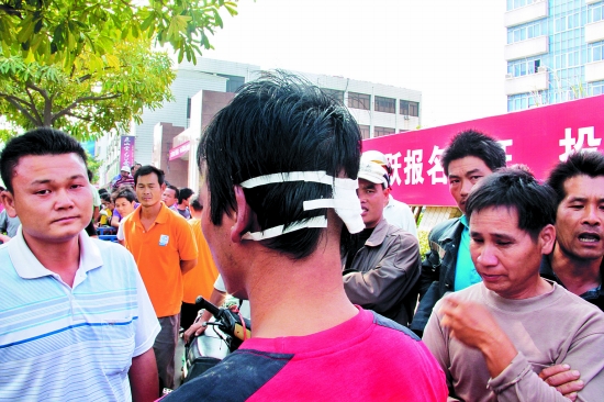 来自广西柳州的菜农黄镫漩告诉记者,17日晚上11点多,他拉着800多斤的一车叶菜来到安海鸿江西路与海八路交叉路口,在路边停车,等待菜贩子前来交易,“突然,我后脑勺被猛地一击,一下子血就流出来了。”