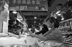 “这些都是平常常吃的东西,便宜了,买起来就更放得开手。不过,也不会买太多,很多都是生鲜嘛,吃不完浪费。”在沃尔玛平价商品专营区前,一位正在选购的顾客对记者说。在现场,走过平价区的顾客们不少都会选购,大米、菜更显热卖,不少购物车中都能看过。不过,由于上午人流不多,还没感觉到很热销的样子。“因为是周日,上午人流都会比较少。”沃尔玛相关负责人黄旭钊介绍,到昨日傍晚,平价区的大米销量便比平常多了30%左右,其他平价商品销量也提高了一两成。“人气应该会呈逐步上升的趋势。”黄旭钊说,平价商品销量应该还会更多。