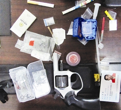 民警从车内搜出五六袋冰毒、一把手枪、6颗子弹,子弹已上膛。