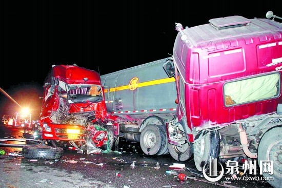 沈海高速泉州段三车追尾 所幸油罐车只剩油渣
