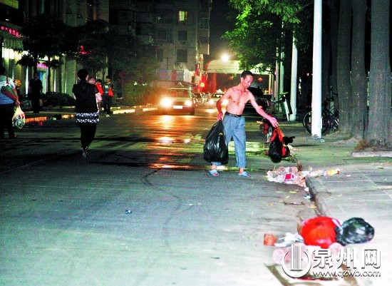 沿着东泽街继续前行,记者发现垃圾主要集中在靠近丰泽街的一头,这一段路只有一个垃圾桶。而在靠近湖心街的一头,仅偶有酒瓶杂物,并无店家将垃圾扔在路边。