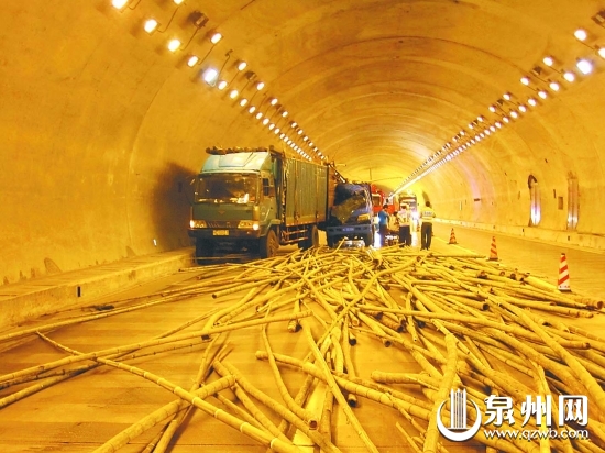 昨日凌晨近5时,泉三高速公路保福岭隧道内,毛某开着一辆满载毛竹的轻型自卸货车,追尾一辆停着修车的满载木材的中型厢式货车,事故造成一人身亡,洒落满地的毛竹阻碍了路面交通。