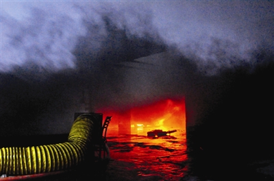 熊熊大火,浓烟滚滚,消防架设排烟机