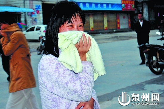 记者看到,围观的人群中,一名妇女手拿湿毛巾。原来,她是住在二楼的张女士。“我是听到摩的师傅叫喊才知道楼下店面着火了,当时烟窜到我家来了。”张女士说,19岁的儿子因左脚骨折行动不便,她把儿子搀扶下楼。
