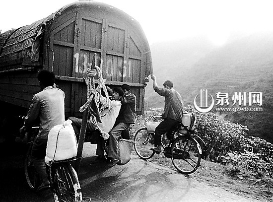 ▲货车拉着自行车前行:这是在永春通往德化公路的一段斜坡上,有两位骑自行车的年轻人正在爬坡,一开始踩得非常吃力,这时恰好有一辆货车经过,由于货车的速度较慢,两个年轻人灵机一动,拉着货车的尾部借力驶过斜坡。(陈世哲/摄)