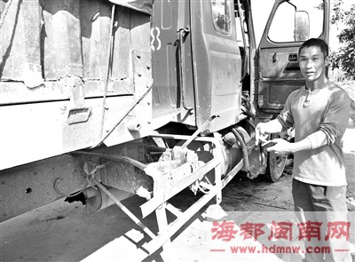 揭师傅的货车停在国道324线丰泽城东段路旁,货车两个电瓶已被卸掉,揭师傅腿上有伤痕。揭师傅说,25日晚10时许,他开车从晋江赶往福州,途经该路段时,发动机烧坏,他只得将车停在公路边,并联系老板派人来修车。26日凌晨,一辆小轿车开过来,他被惊醒后发现,原来是两名偷油贼,拿着抽液泵站在货车油箱旁,好在小偷也发现他,立即开车逃走。