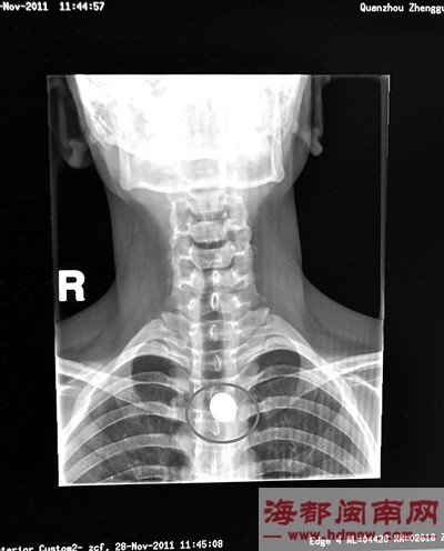 男子送医检查,医生称硬币被卡在食道中(如图),只需待其慢慢排出体外,此外男子嘴角外伤引起吐了口血。