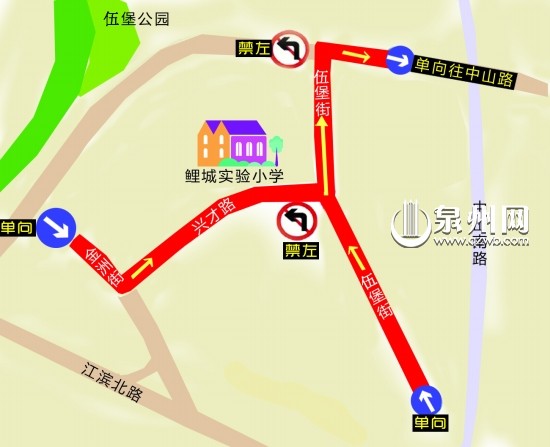 鲤城交警大队提醒,上学高峰期即7:30—8:00、16:00—18:00,往市区兴才路、伍堡街(与兴才路连接段)的机动车辆,请按金洲街→兴才路→伍堡街→义全街方向行驶,禁止机动车辆从义全街经伍堡街驶往兴才路。禁止机动车辆从土地后经伍堡街驶往兴才路(从土地后→伍堡街→义全街方向行驶的暂不限制);义全街与伍堡街交叉路口禁止机动车辆左转弯。中山南路执行自北往南单向通行、义全街与金洲街交叉路口执行禁止机动车辆左转弯管理措施不变。过往车辆请按照标志牌指示行驶,并请从中山南路以东路段(含)驶往兴才路的车辆注意从土地路→金洲街→兴才路绕行。