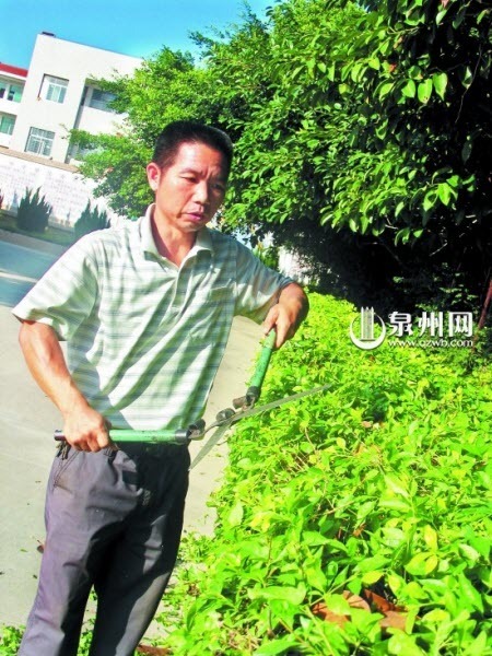 再一看,形单影只的一个人穿着短袖,抄着一把大剪刀,有力又均匀地修剪着冬青灌木丛。豆大的汗珠挂在他的额头上,却丝毫不影响他手中的大剪刀一张一合。他,就是本文的主人公——余祀强。