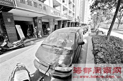 读者赖女士:市区刺桐南路阳光曼哈顿附近,一辆小车停靠在我店门外通道上达半个月之久,一直没人开走过,影响做生意。