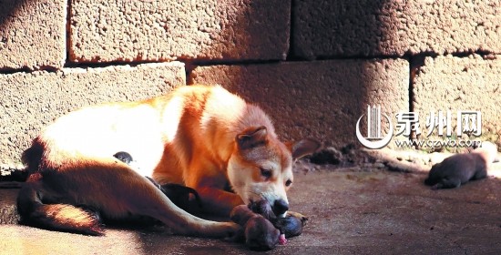 阳光透过墙外照进来,狗妈妈趴在阳光照得到的地方,其身旁围着五六只小狗崽。狗妈妈眯着眼睛,时而用舌头舔着小狗崽的身子;时而又非常警觉地站起来,盯着门口,吠叫几声。