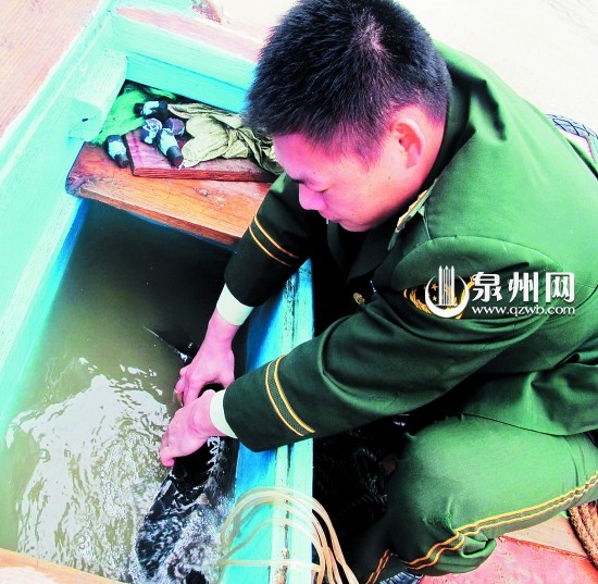 为防止这条中华鲟再次被渔民误捕,边防民警这回用车将它远载到石狮石湖码头附近海域放生。