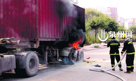昨日中午11时13分,南安消防美林中队接到报警后,立即出动警力赶赴现场扑救。当时货车左侧后轮在燃烧,肆虐的火焰还伴随着滚滚黑烟。消防官兵立即铺设水带进行扑救,火焰在水龙的浇灌下很快被扑灭。