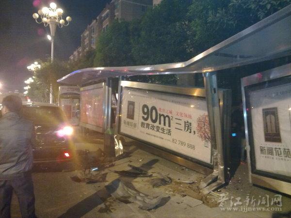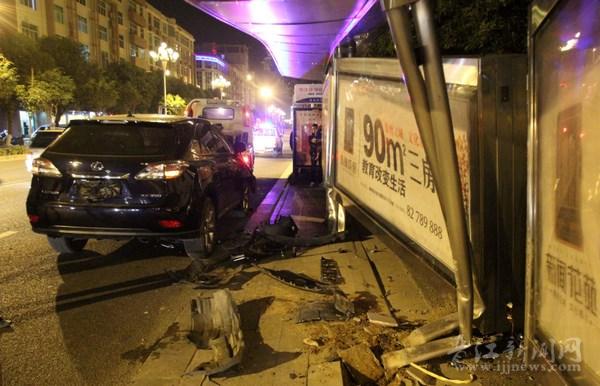 东南网-晋江经济报12月26日讯(记者 林雅萍 秦越 文/图)昨晚9:15,一部黑色凌志越野车撞上了迎宾路地税局附近的公交站点,站点两根铁柱被连根拔起,地砖破裂,公交亭瞬间成了“V”字型,摇摇欲倒。