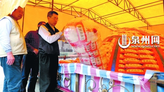 早报讯(记者陈祥木 文/图)昨日,泉州、台湾澎湖两地妈祖宫、天后宫联合制成了龙年大“米龟”。这只由3万斤优质大米制作而成的大“米龟”,开始正式亮相泉州霞洲妈祖宫。据悉,龙年“泉澎祈龟民俗文化活动”将于元宵期间在泉州霞洲妈祖宫举行,活动结束后,东南早报、泉州霞洲妈祖宫将联合把制作大“米龟”的3万斤“平安米”中的一部分,分发给部分困难户。
