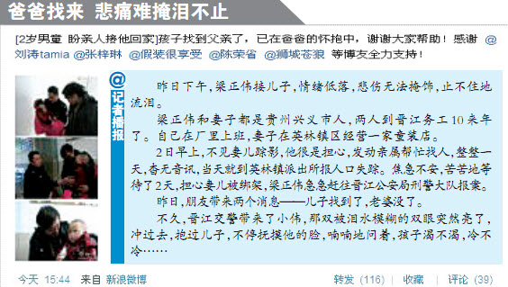 - 2011-11-29微博寻亲成功第一人 回报社会加入“宝贝回家”