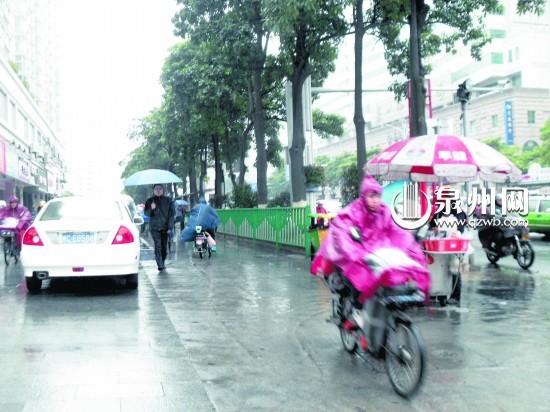 昨天上午,天空下起了细雨,记者来到丰泽街,当时正逢上班的高峰期,一排小轿车停在人行道的中间,行人和非机动车辆只能在两侧穿行,路面显得非常拥挤。
