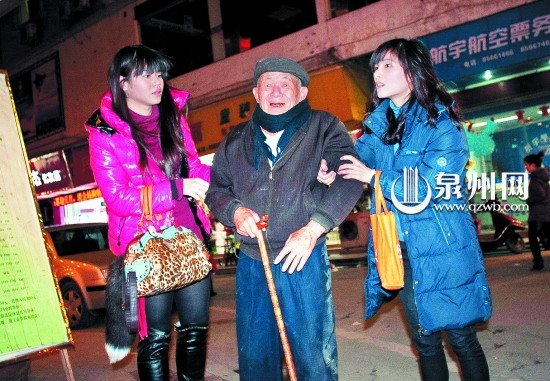 昨晚6点,在晋江青阳大剧院附近,一位正在散步的老人因为体力不支,摔倒在地。两位路过的女子当即上前将他扶起,并用自己的车将老人送回家。