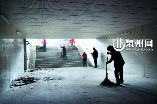 本报讯 (记者 吴志明)刚建好不久的下穿人行通道里一片漆黑,通道里满是垃圾,甚至有大量的排泄物,11日,本报第7版刊发了《地下通道当“公厕” 市民呼吁制止不文明行为》一文,报道了泉州高铁火车站站前东西大道和南北大道交汇处下穿人行通道的不和谐一幕。相关部门昨日紧急出动,组织人员对下穿人行通道进行大清理。