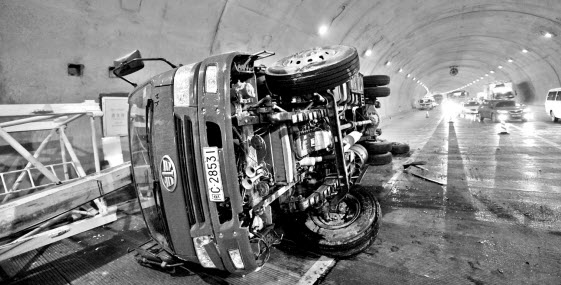 事件实录:短短30多米的龙首岭隧道内,一辆大挂车和一辆白色货车强烈撞击隧道边导致车头受损,一辆货车因刹车失灵侧身翻倒。关于事故原因,3位司机均称,是路面太滑,导致刹车、打方向失灵。