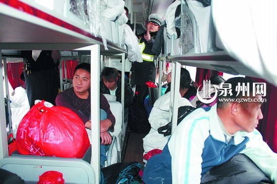 早报讯 (记者许小程 詹伟志 通讯员许昭明 文/图)春运期间正逢客流高峰期,超载手段也层出不穷。昨天,一辆从石狮开往河南鹿邑的卧铺客车,竟然让两个人挤一个座位,遇到检查时,索性把人藏在被子里面。