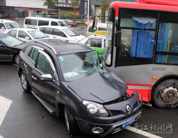 11时45分左右,记者赶到现场时,尼桑小车正准备被拖走,只见其整个后尾部被撞凹。不远处,一部15路公交车斜着停在路上,车头紧紧顶住雷诺越野车车身左侧,驾驶座旁的玻璃破碎。雷诺越野车被撞得严重变形,车上的安全气囊都已打开。