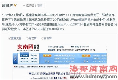 东南网-海都闽南版2月1日讯(记者 韩婧) 童话大王郑渊洁前天发微博,寻找20年前给他寄明信片的泉州小读者。在众多网友的帮助下,已为人父的主人公刘峰现身(详见本报昨日A5版报道)。昨日上午,郑渊洁微博转发了本报的报道,他还在微博中说,“看到刘峰想要我的签名,我要送给他女儿一本签名的《皮皮鲁送你100条命》”。