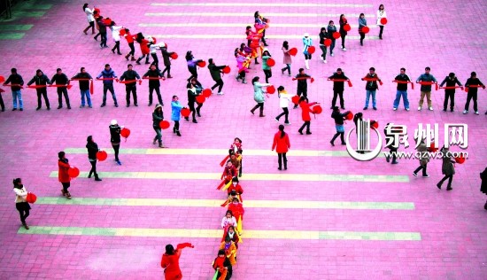 在惠南中学的操场上,参加“欢乐元宵·舞动泉州”广场舞表演的队伍,顶着寒风,正在紧张排练。