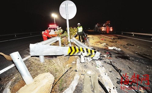 记者从现场工作人员的转述中获知,因为整辆车是被防护栏劈开的,现场惨烈。