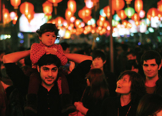 加拿大人Bobby,娶了泉州姑娘小刘。昨晚,他带着不到3岁的女儿卡梅隆赏灯。骑在爸爸头上的卡梅隆显然被人多蒙住了,她妈妈则只好不停逗她