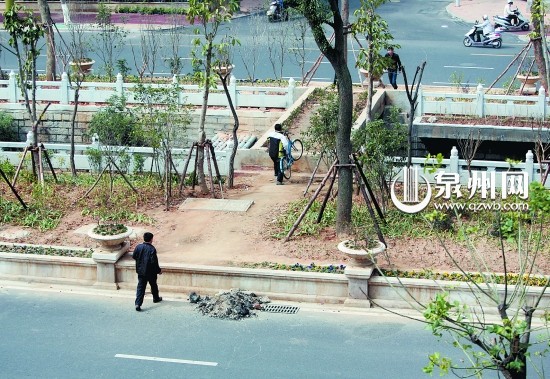 在刺桐北路西侧的兰台路路口和东侧的煌华商业大厦路口,这里的绿化带建在内沟河上的平台上,虽然外围拉起了铁丝网,不过这也没能挡住过往市民的脚步。黄色的泥巴,在旁边的鲜花绿草间,显得格外刺眼。